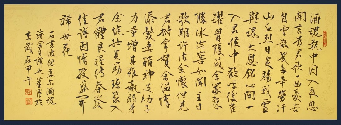 为了完成这幅作品,我进行了五道工序。第一道,把波德莱尔的诗翻译成了汉语。第二道,把翻译过来的波德莱尔的白话文诗转化为了古体诗。第三道,将这首古诗写成了书法作品。第四道,我撰写了两篇文章,一篇法语,一篇汉语,探讨中法历史上,酒对文学、艺术,尤其是对诗歌的不同影响,比方说李白与波德莱尔的差异。