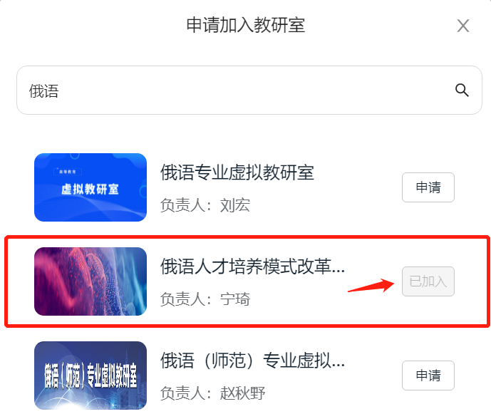 下拉菜单,选择“俄语人才培养模式改革虚拟教研室”,点击【申请】
