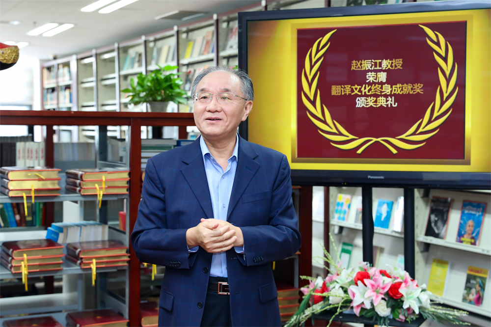 赵振江教授对翻译协会授予的奖项表示了感谢,并和大家分享了自己翻译生涯的心得。他说,自己在文化翻译方面取得的成绩是党和人民几十年来培养教育的结果。作为一名64年党龄的中国共产党员,他是共产党和新中国培养的知识分子,应无条件把国家和人民的需要放在首位,把个人兴趣和家国情怀统一起来。这样,无论做什么工作,都会审时度势,砥砺前行,一定会取得积极的成果。他还强调无论做什么工作,一旦选定了方向,就要锲而不舍,持之以恒,任何事业,都是干出来的,干是硬道理。最后,赵老师再次感谢了中国翻译协会授予的荣誉,并表示将翻译更多西语诗歌精品,为促进中外文化交流、繁荣我国诗歌创作做力所能及的贡献。