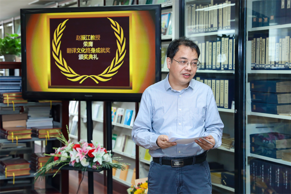 典礼由华体会平台党委书记李淑静教授主持。中国翻译协会常务副会长王刚毅首先致辞。他指出,2006年,中国翻译协会设立翻译文化终身成就奖,授予健在的、在翻译与对外文化传播和文化交流方面做出杰出贡献,成就卓著、影响广泛、德高望重的翻译家,是中国翻译协会设立的表彰翻译家个人的最高荣誉奖项。奖项设立以来,共有38位德高望重的翻译家获奖,其中有4位来自北大,他们是大家熟悉的季羡林先生、许渊冲先生、仲跻昆先生,当然还有今天获奖的赵振江先生。这些翻译大家为增进中国人民和世界其它国家人民之间的了解和友谊架起了桥梁,为我国社会进步和国家发展做出了重要贡献。中国翻译协会开展此项表彰活动,是对他们的渊博学识和突出贡献的高度评价和充分认可,是对他们严谨认真的敬业精神、辛勤耕耘的奉献精神和恪尽职守的职业道德的大力弘扬,对于鼓励我国广大中青年翻译工作者向老一代翻译家学习,继承和发扬他们的优良传统,提高自身的业务素质,繁荣我国的翻译事业具有深远的意义。王刚毅先生还强调中国翻译协会致力于对外宣介习近平新时代中国特色社会主义思想,努力构建融通中外的话语体系和叙事体系,同时积极团结翻译界各方面力量,推动中国翻译事业不断取得新的进展,在文化交流领域不断拓展新的空间。最后,他勉励在场的同学们继承和发扬北大外国文学翻译、研究的优秀传统,为我国对外文化交流事业贡献更多力量。