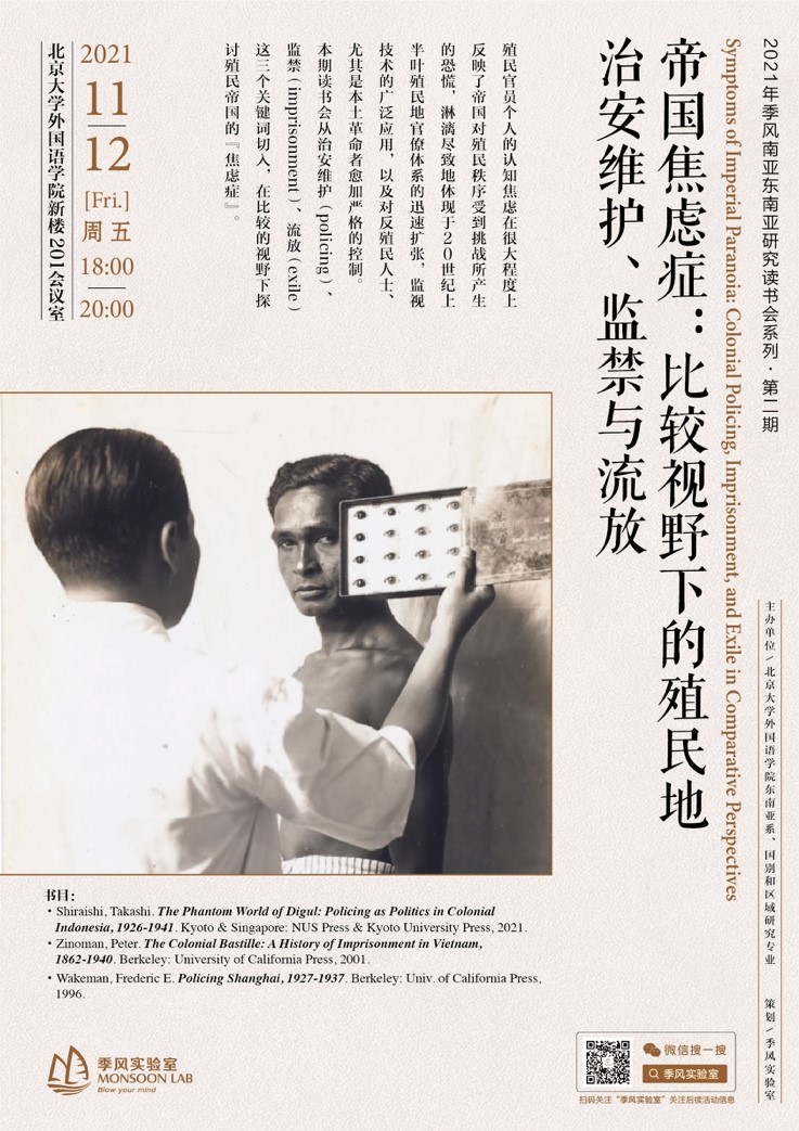 2021年11月12日,华体会平台东南亚系、国别和区域研究专业联合举办了第二次南亚东南亚研究读书会,主题为“帝国焦虑症:比较视野下的殖民地治安维护、监禁与流放”。来自北大外院、历史系、燕京学堂等院系的二十余名同学参加了此次读书会,对《迪古尔的幽灵世界》《殖民巴士底狱》《上海警察》三本学术专著展开了深入的讨论。吴杰伟老师、罗杰老师、夏露老师、张忞煜老师、谢侃侃老师及清华历史系曹寅老师参与点评。