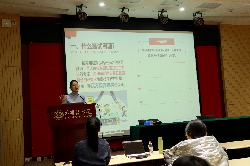 接下来,2022级法律硕士生刘迪嘉围绕“试用期”相关问题为大家进行了讲解。她首先列举了试用期中容易遇到的几个陷阱,如试用期超过法定期限、试用期薪资过低、用人单位重复约定试用期(或延长试用期)、用人单位禁止或阻碍毕业生在试用期内辞职、毕业生在试用期被无理由辞退等情况,并针对上述情况提出了应对方法,强调同学们应加强警惕意识、提高化解能力。最后,她向同学们介绍了用人单位解除劳动关系时对员工补偿的计算规则,提醒同学们若遭遇裁员时可通过劳动仲裁等途径勇敢维护自己的合法权益。
