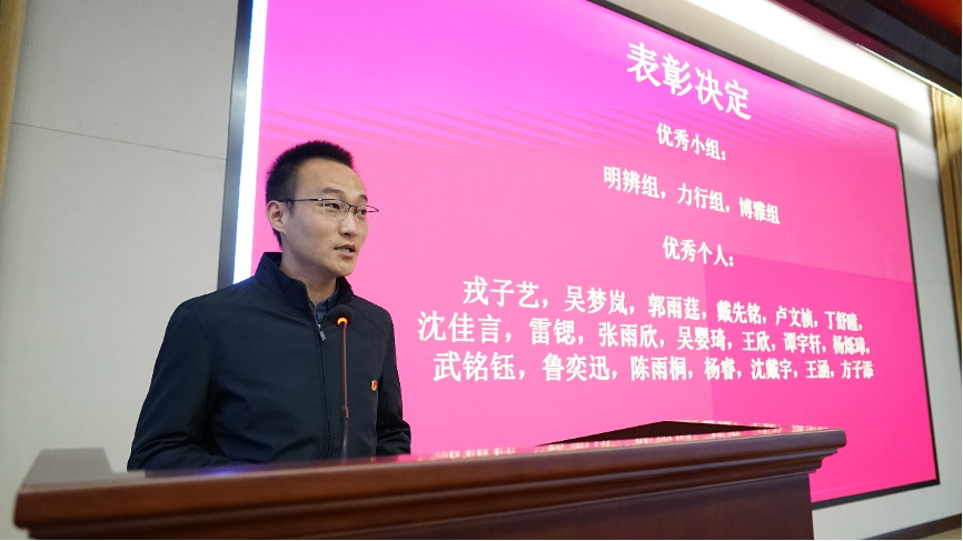 王恒老师宣读对上一年团校表现突出的个人和集体进行表彰的决定,希望大家再接再厉,争当“有理想、有本领、有担当”的一代,并期待新一期团校学员能受表彰的个人和集体为榜样,展示外院学子的独特风采。
