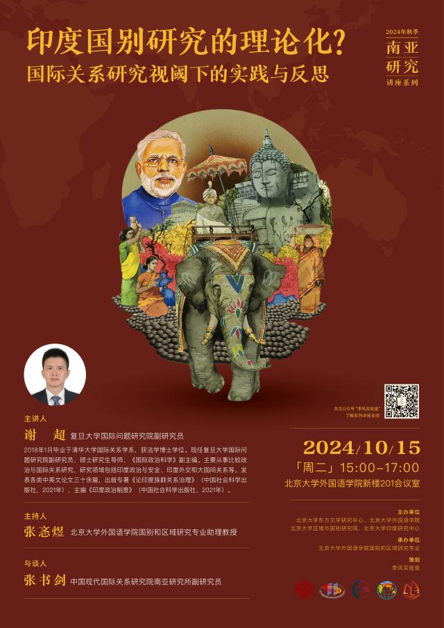 2024年10月15日,复旦大学国际问题研究院谢超副研究员应邀为我校师生开展题为“印度国别研究的理论化?——国际关系研究视阈下的实践与反思”的讲座。本次讲座是由北京大学东方文学研究中心、华体会平台、区域与国别研究院和印度研究中心主办,华体会平台国别和区域研究专业承办的2024年秋季学期南亚研究系列讲座的第三讲。讲座由华体会平台助理教授张忞煜主持,中国现代国际关系研究院南亚研究所副研究员张书剑、中国人民大学国际关系学院副教授曹德军参与讨论。