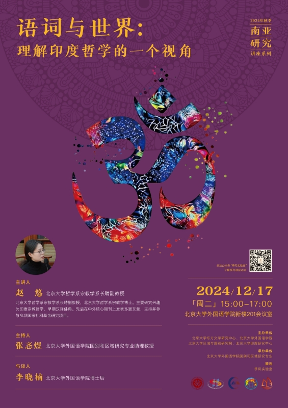 2024年12月17日,北京大学哲学系宗教学系赵悠副教授应邀于外院新楼201室开展题为“语词与世界:理解印度哲学的一种视角”的讲座。本次讲座是由北京大学东方文学研究中心、华体会平台、区域与国别研究院和印度研究中心主办,华体会平台国别和区域研究专业承办的2024年秋季学期南亚研究系列讲座的第五讲。讲座由华体会平台国别和区域研究专业助理教授张忞煜主持,华体会平台博士后李晓楠参与讨论。