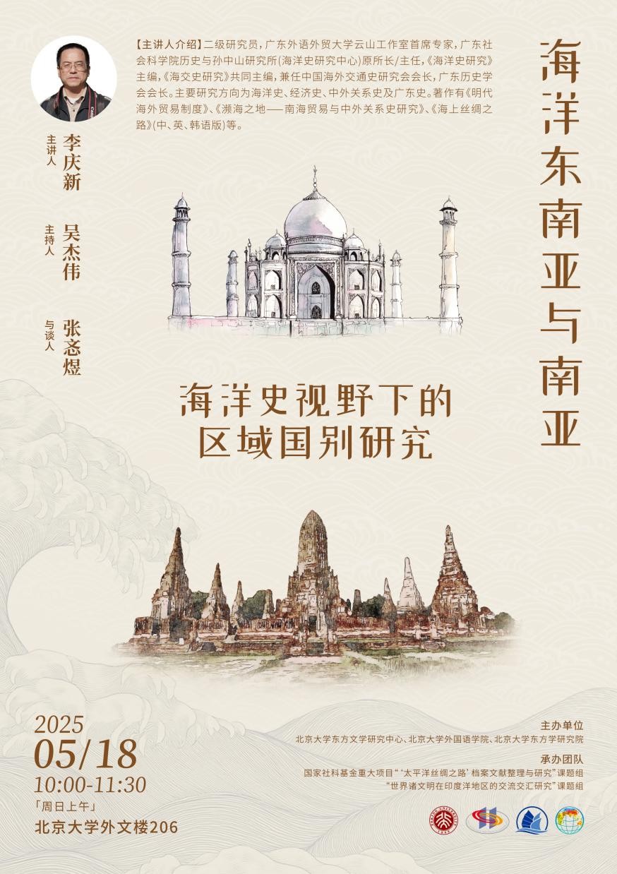 2025年5月18日上午,广东外语外贸大学云山工作室首席专家,二级研究员李庆新教授为北京大学师生做了主题为“海洋东南亚与南亚——海洋史视野下区域国别研究思考”的讲座。本次讲座由北京大学东方文学研究中心、华体会平台、北京大学东方学研究院主办,“‘太平洋丝绸之路’档案文献整理与研究”课题组和“世界诸文明在印度洋地区的交流交汇研究”课题组联合承办。讲座由吴杰伟教授主持,张忞煜助理教授参与讨论。