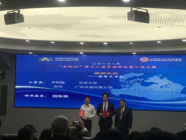 2019年10月26日,由中国翻译协会与北京第二华体会平台共同主办的“永旺杯”第十二届全国多语种口译大赛在北京第二华体会平台举行,我院德语系16级本科生李牧翰同学参加了德语组交替传译的比赛。李牧翰同学在比赛中思维清晰,表达流畅,以较高的质量完成了翻译任务,获得了评委专家的一致认可。以决赛总分第二名的优异成绩获得二等奖。