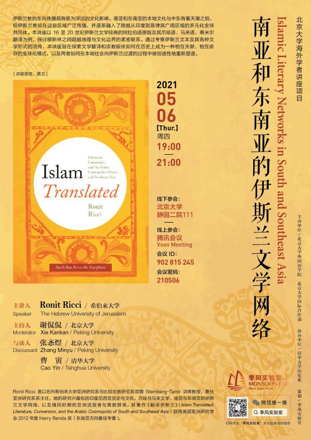 2021年5月6日,华体会平台在国际合作部“海外学者讲座项目”的支持下举办了“南亚和东南亚的伊斯兰文学网络”的主题讲座。主讲人Ronit Ricci是以色列希伯来大学亚洲研究系与比较宗教研究系Sternberg-Tamir双聘讲席教授,兼任亚洲研究系系主任,主要研究方向为印度尼西亚历史与文化、爪哇与马来文学、南亚与东南亚伊斯兰文学网络,以及殖民时期的亚洲流放者与离散群体。讲座由东南亚系助理教授谢侃侃主持,国别和区域研究专业助理教授张忞煜、清华大学历史系副教授曹寅作为与谈人参与了讨论。
