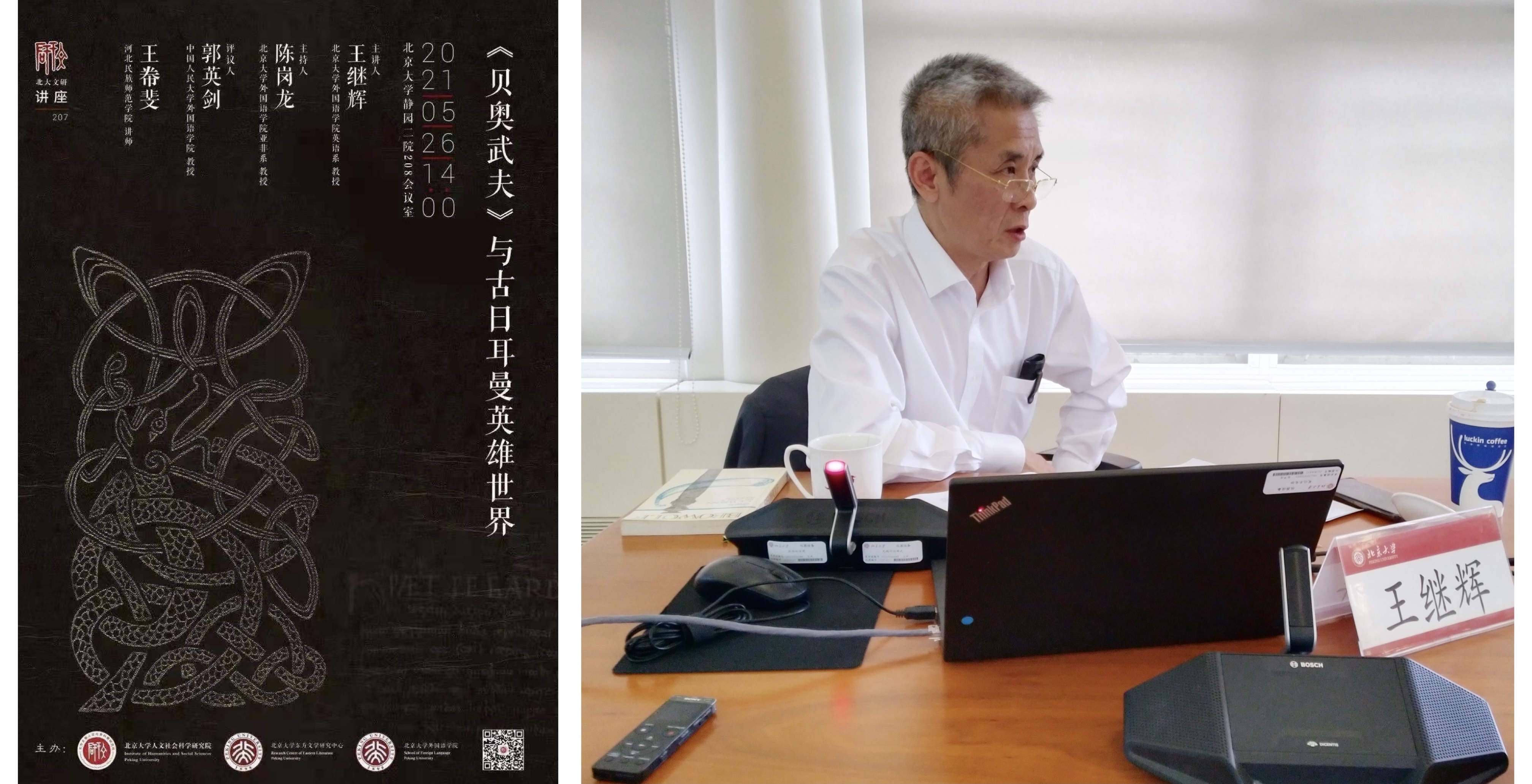 2021年5月26日下午,华体会平台英语系王继辉教授主讲的“《贝奥武夫》与古日耳曼英雄世界”讲座在线下线上同步举行。本次讲座由陈岗龙教授主持,中国人民大学华体会平台郭英剑教授、河北民族师范学院王帣斐老师评议。
