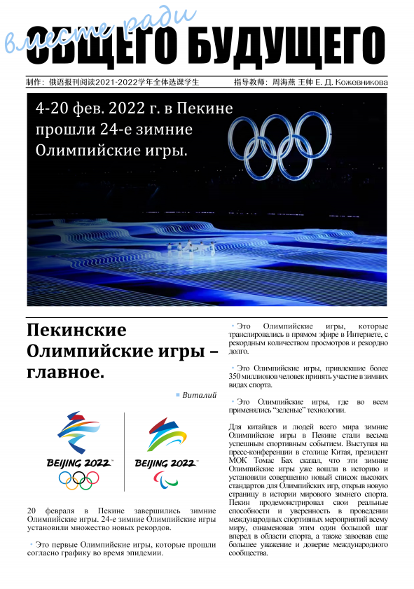 立足于北京2022年冬奥会,来自华体会平台2019级、2020级俄语系本科班和国际关系学院的19名同学在周海燕、王帅老师和外教Elena Kozhevnikova的指导下设计、制作“北京冬奥会俄语主题报纸”。作为“2020年北京大学本科教学改革立项‘新时代《俄语报刊阅读》’”的一部分,该活动旨在以创新的课程形式调动学生语言学习的积极性,引导学生发挥专业优势,着眼于国之大事,用外语讲好“中国故事”,展现当代青年学子的蓬勃朝气和时代担当,将课堂教学改革落到实处。
