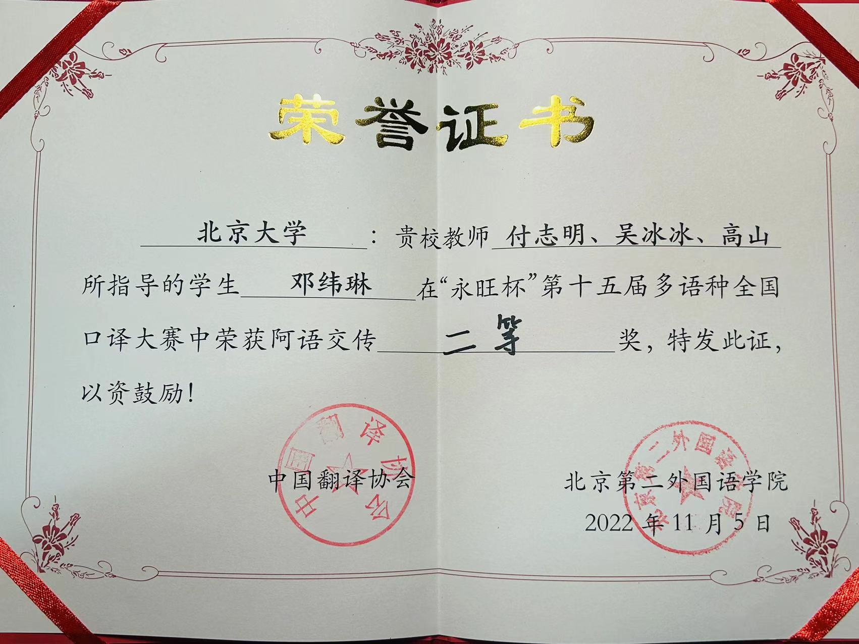 经过激烈角逐,华体会平台阿拉伯语系2020级硕士生邓纬琳荣获阿语交传二等奖。