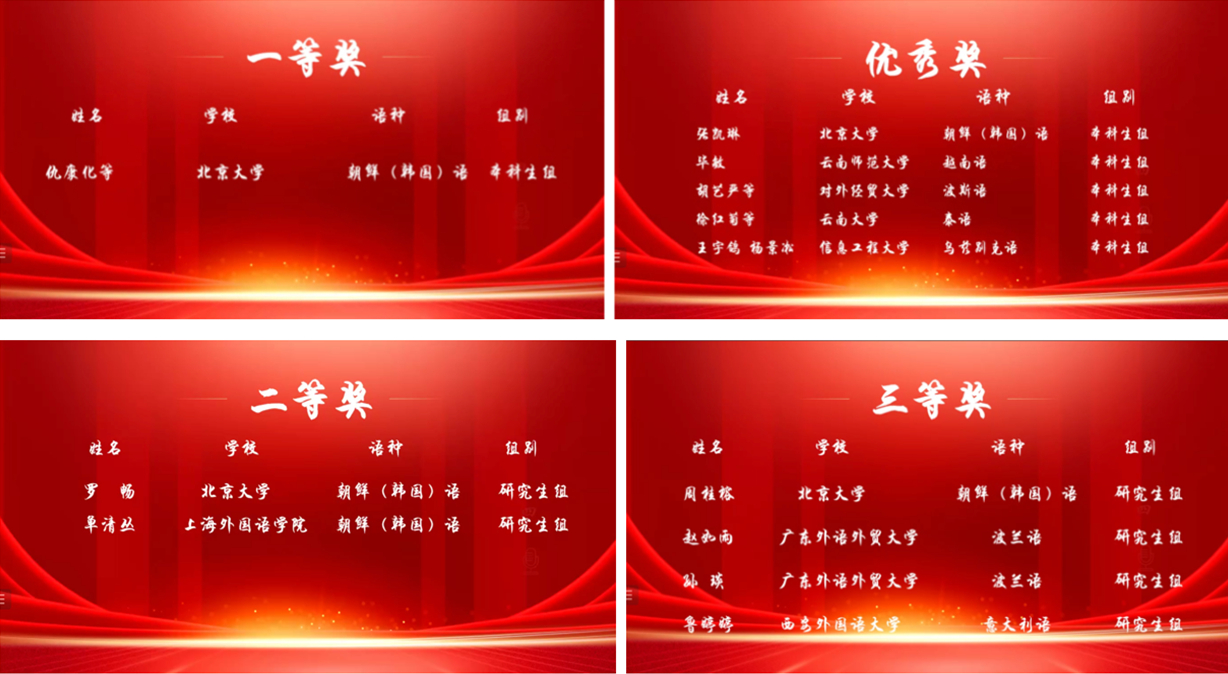 朝(韩)语系共推荐8组(9名)学生参加本次论坛,其中4组(5名)学生入围决赛。经过激烈的角逐,本科生组2019级仇康化同学、2018级徐丽博同学与英语系2019级周子萱同学获一等奖(论文题目:《非英语外语专业本科生外语学习倦怠现象及相关性研究——以华体会平台为例》,指导老师:王丹老师),2020级张凯琳同学获优秀奖(论文题目:《帕尔默文化语言学视域下的韩国桃花意象研究》,指导老师:琴知雅老师);研究生组2019级博士生罗畅同学获二等奖(论文题目:《基于语料库的韩国语教学用词表构建研究》,指导老师:王丹老师),2021级硕士生周桂榕同学获研究生组三等奖(论文题目:《社会分层视角下的朝鲜朝前期译官政治地位研究》,指导教师:琴知雅老师)。
