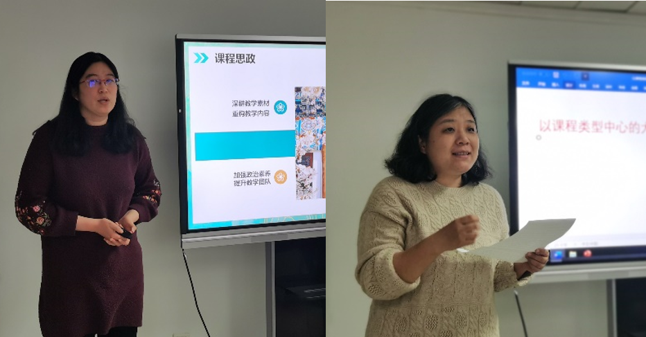 董欣老师代表写作与词汇组发言,结合《文艺复兴艺术作品与圣经故事》、《北京和上海:中国历史上的双城记》、《科技前沿英语》、《分析性写作》、《批判性思维写作》和《实用基础英语写作》等课程的实际和学生能力培养的目标,从中西文化对比、培养学生的思辨能力和引导学生了解中国科技发展所取得的巨大进步等几个方面,探索了将思政元素应用于课堂教学的新思路和新方法。