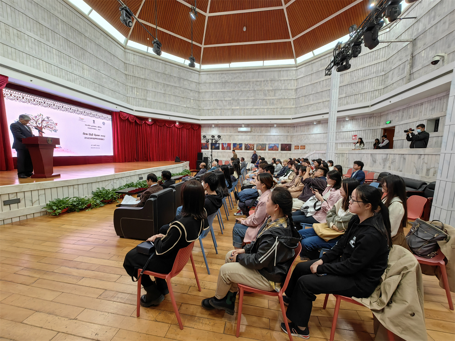 庆祝活动在印度驻华大使罗国栋(Pradeep Kumar Rawat)先生及学界前辈的致辞中拉开帷幕。随后,罗国栋先生为本年度“世界印地语日”主题竞赛的获奖同学颁奖。来自我院南亚学系印地语专业的2019级本科生嵇真妍和2021级本科生赖思嘉,在“印地语视频演讲比赛”中获奖。活动现场播放了两位同学以“我最喜欢的印地语电影”为题制作的演讲短视频,她们流利的表达和独到的见解赢得了阵阵掌声。
