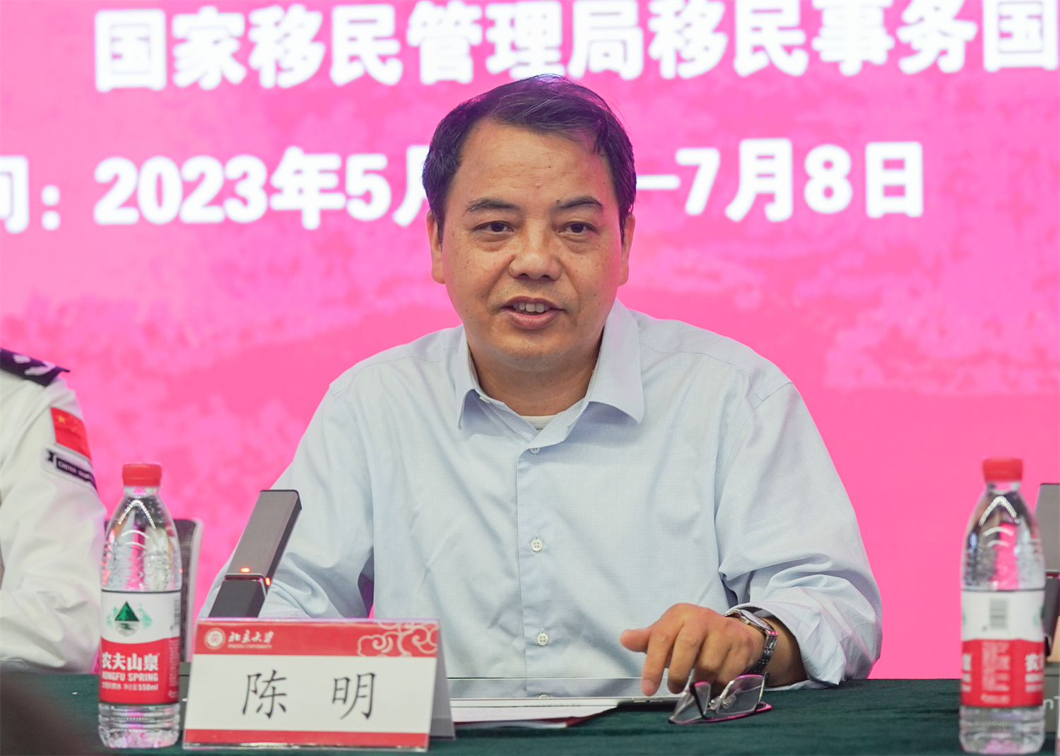 首先,陈明院长对与会领导、老师和学员的到来表示欢迎,他介绍了北大外院的历史沿革和发展历程,介绍了北大外语学科在学科建设、人才培养和社会服务中的举措和取得的一系列突出建设进展和成果。他强调,今年是学习贯彻党的二十大精神开局之年,恰逢北京大学建校125周年,同时,北京大学将2023年定位为“国际战略年”,本次北大华体会平台接受国家移民管理局的委托,共同举办“第二期小语种人才培训班”,是学院服务国家战略、深化双方在人才培养合作方面的又一次实践。他鼓励培训学员在燕园静心充电,努力学习,在感受校园氛围的同时,收获知识、收获友谊,就此结下每一个人的北大学缘。