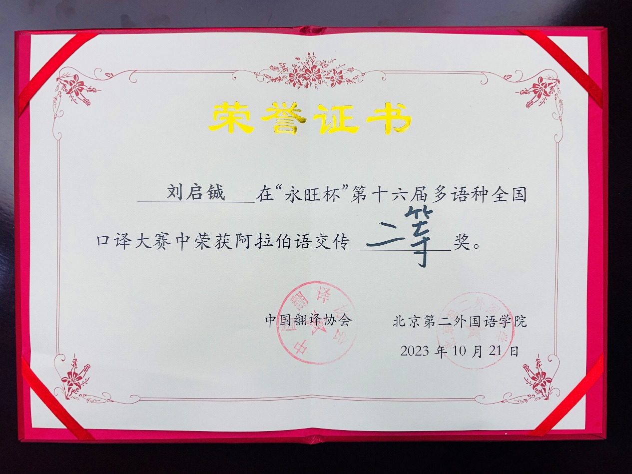 2023年10月21日,由中国翻译协会与北京第二华体会平台联合主办的“永旺杯”第十六届多语种全国口译大赛落下帷幕。在我院阿拉伯语系各位教师的大力支持,特别是助理教授高山(Alaa Mamdouh Akef)的悉心指导下,阿拉伯语系2023级研究生刘启铖代表北京大学参赛,荣获阿拉伯语交替传译组二等奖。