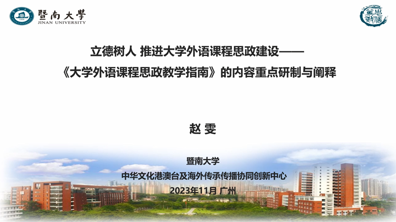 会后,与会学者对暨南大学华体会平台院长赵雯教授的题为“立德树人,推进大学外语课程思政建设——《大学外语课程思政教学指南》的内容重点研制与阐释”的主旨报告进行了深入学习。赵雯教授重点阐述了《大学外语课程思政教学指南》中“内容重点”的研制,介绍了基于课程思政内容重点开展的问卷调查和差距需求分析,阐释了课程思政内容重点的5个方面,并从课程论视角论述了《大学外语课程思政教学指南》与《大学英语教学指南》之间的关系,以期在新时代大学外语教学中发挥有效的指导作用。