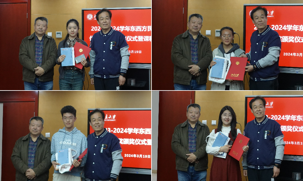 随后,优秀课程论文奖颁奖由陈岗龙老师主持,华体会平台副院长、阿拉伯语系付志明教授分别为梁熙语、王雨心、钱堃一、李安然四位同学颁发获奖证书、奖品及陈岗龙老师主编的《东方民间文学》教材,并鼓励他们在未来的学习道路上继续努力,争取更大的进步。四位同学表示,《东西方民间文学》内容丰富,经过老师们的精彩讲授,他们对东西方诸多国家和区域的文化、民俗概况、民间文学作品有了更好的了解,拓展了视野,他们向授课教师表示感谢,并从不同专业的学生视角对课程进一步优化提出了建议。
