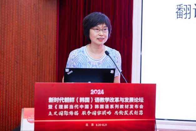 王丹教授以《新时代国际传播人才培养的新探索:对“理解当代中国”系列课程建设的思考与建议》为题进行发言。作为“理解当代中国”韩国语系列教材的总主编,王教授详细阐述了教材编写的背景与重要性,并对《韩国语读写教程》《韩国语演讲教程》《汉韩翻译教程》《高级汉韩翻译教程》四个分册的教材使用和课程建设提出了具体建议。她期望这套教材能够激发学生从跨文化视角探究中国理论,挖掘当代中国的发展密码,并为解决全球性问题提供中国的智慧和方案。