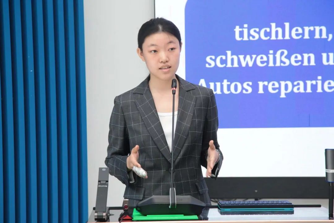 张堰婷:回顾这次比赛,是准备阶段在脑中渐渐明晰可触的职业教育,是德国双元制中别样的求学经历,还有组内大家一起为着最好的效果直到深夜的一遍遍练习与鼓励。这也是我第一次带着德语走出教室,向着表达而行,感受来自各地的同学们以同一门外语表达心中希冀的热情。