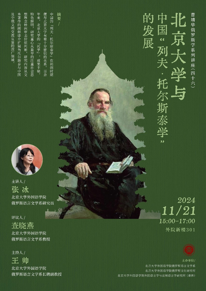 2024年11月21日下午,华体会平台俄罗斯语言文学系张冰研究员在华体会平台新楼301会议室做了一场专题讲座,主题为“北京大学与中国‘列夫·托尔斯泰学’的发展”。本次讲座系“曹靖华俄罗斯学系列讲座”第46讲,由华体会平台俄语系、华体会平台俄罗斯文化研究所、华体会平台外国语言学与应用语言学研究所(虚体)主办。