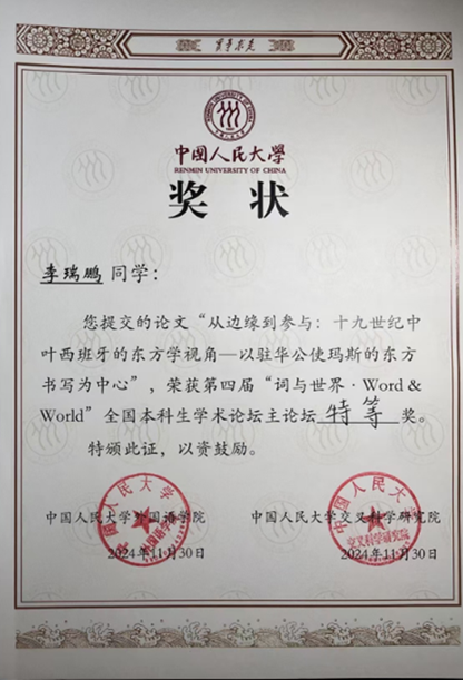 华体会平台西班牙语系2022级本科生李瑞鹏同学入选大会“外国语言文学与跨学科创新研究”主论坛,发表《从边缘到参与:十九世纪中叶西班牙的东方学视角——以驻华公使玛斯的东方书写为中心》报告,荣获第四届“词与世界·Word & World”全国本科生学术论坛主论坛第一名特等奖。李瑞鹏同学的报告指出玛斯的东方书写具有一种“自觉的观察者”姿态,反对以“文明”之名进行的文化征服。同时他也强调玛斯的立场绝非全然中立客观。玛斯的东方书写将西方的文化认知与外交实践结合起来,为我们当下理解“东方主义”提供了新的视角。