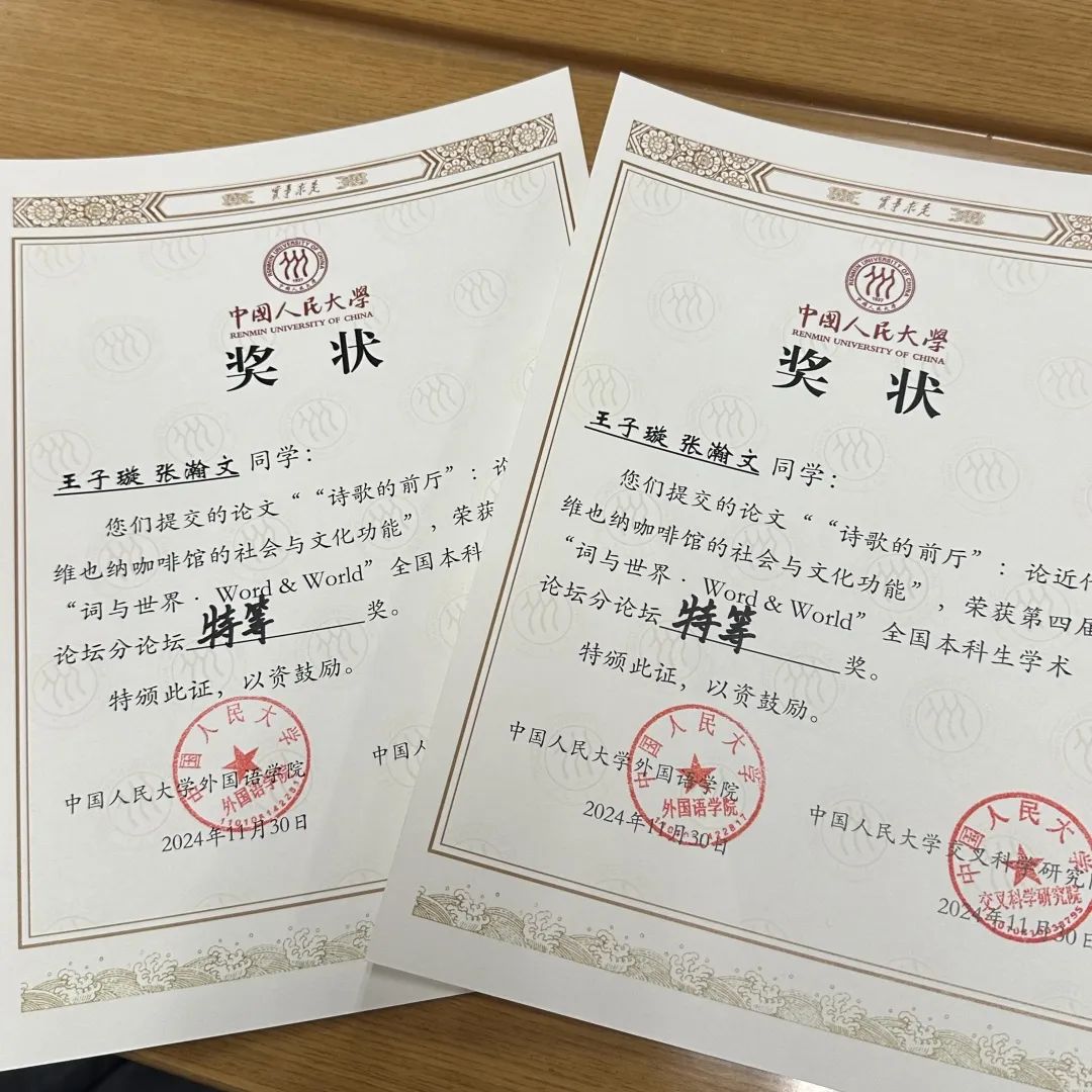2024年11月30日,由中国人民大学华体会平台、交叉科学研究院主办的第四届“词与世界”全国本科生学术论坛顺利落幕。本届论坛以“外国语言文学与跨学科创新”为主题,涵盖英语、法语、德语、日语、俄语、西班牙语六个语种,面向全国高校本科生征稿。华体会平台德语系2023级本科生王子璇、张瀚文在德语系林琳老师的指导下,完成了以《‘诗歌的前厅’:论近代维也纳咖啡馆的社会与文化功能》为题的研究,在论坛宣读报告,最终荣获分论坛特等奖的殊荣。