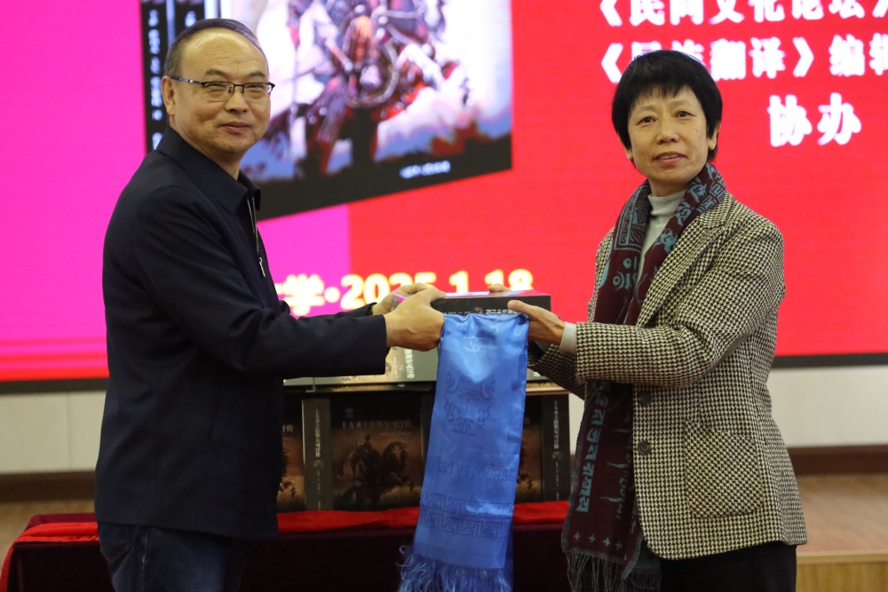 近日,北京大学陈岗龙教授主持翻译的《十方圣主格斯尔可汗传》(上下册)由内蒙古人民出版社出版发行。由北京大学东方文学研究中心、华体会平台和内蒙古人民出版社主办的《十方圣主格斯尔可汗传》新书首发式暨出版座谈会于2025年1月18日在北京大学隆重举行。来自内蒙古出版集团、中国社会科学院、国家民族事务委员会、中国民间文艺家协会、中国民族语文翻译局、中国艺术研究院、中央美术学院、国家图书馆、中央民族大学、北京外国语大学、河北师范大学和北京大学等单位的50余位领导嘉宾、专家学者出席了本次活动。首发仪式由东方文学研究中心主任助理史阳主持,出版座谈会由东方文学研究中心主任助理翁家慧主持。