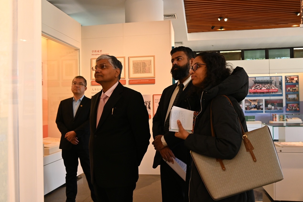 会见后,罗国栋一行移步至北京大学校史馆,在北京大学档案馆、校史馆馆长余浚陪同下,参观“百年回眸:北大的印度学学科建设与中印人文交流展”,华体会平台南亚学系博士生郭家誉为嘉宾详细导览。展览通过珍贵文献、历史照片及学术成果,系统梳理了北京大学印度学学科百年发展历程,展示了历代北大学者在印度宗教、哲学、文学、图像学、语言教学等领域的丰硕成果。北大的印度学科不仅是中国早期东方学的重要组成部分,也为中国东方学学科的建设和发展树立了标杆,并将继续为新时代的印度学学科建设发挥关键作用。观展结束后,罗国栋为北京大学校史馆写下亲笔留言,并与接待嘉宾合影留念。