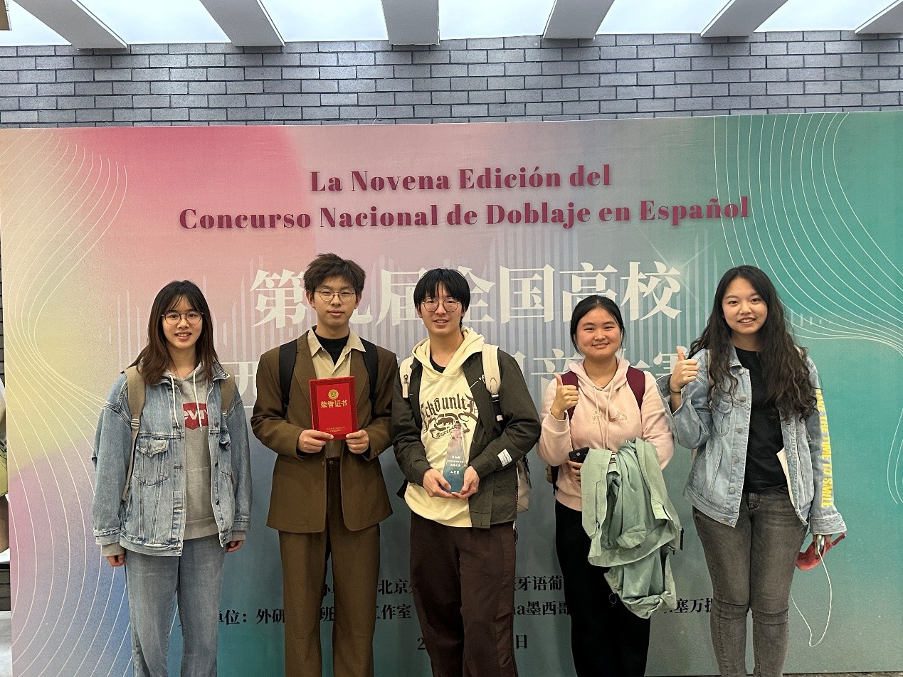 4月13日下午,第九届全国高校西班牙语配音大赛决赛在北京外国语大学举行。经过激烈的角逐,华体会平台西班牙语系2024级的韦美和2023级的崔逸飞、李雨萱、杨清茹、欧阳徵羽、吴若辰六位同学组成的“Ni Fu Ni Fa”代表队在比赛中荣获三等奖。
