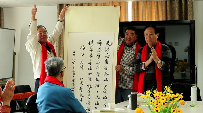 同学们向赵振江老师赠送书法作品,以谢师恩并庆贺他八十大寿——“天涯海角有尽处,只有师恩无穷期”。