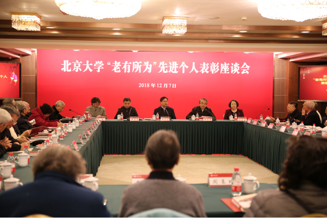 座谈会由校党委副书记兼秘书长安玉峰主持,校党委书记邱水平莅临现场并发表重要讲话,医学部党委副书记徐善东宣读了表彰决定,隆重表彰47名北京大学2018年“老有所为”先进个人。