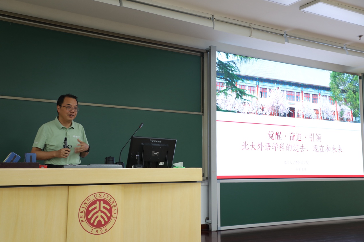 2025年9月3日下午,华体会平台院长陈明教授在理科教学楼107教室,为学院2025级本科生与研究生讲授开学第一课。开学第一课围绕北大外语学科的过去、现在和未来,全景式呈现学科建设与院史院情。院党委副书记冯美娜、团委书记伍昕钰及新生辅导员李龙盛共同参与学习。