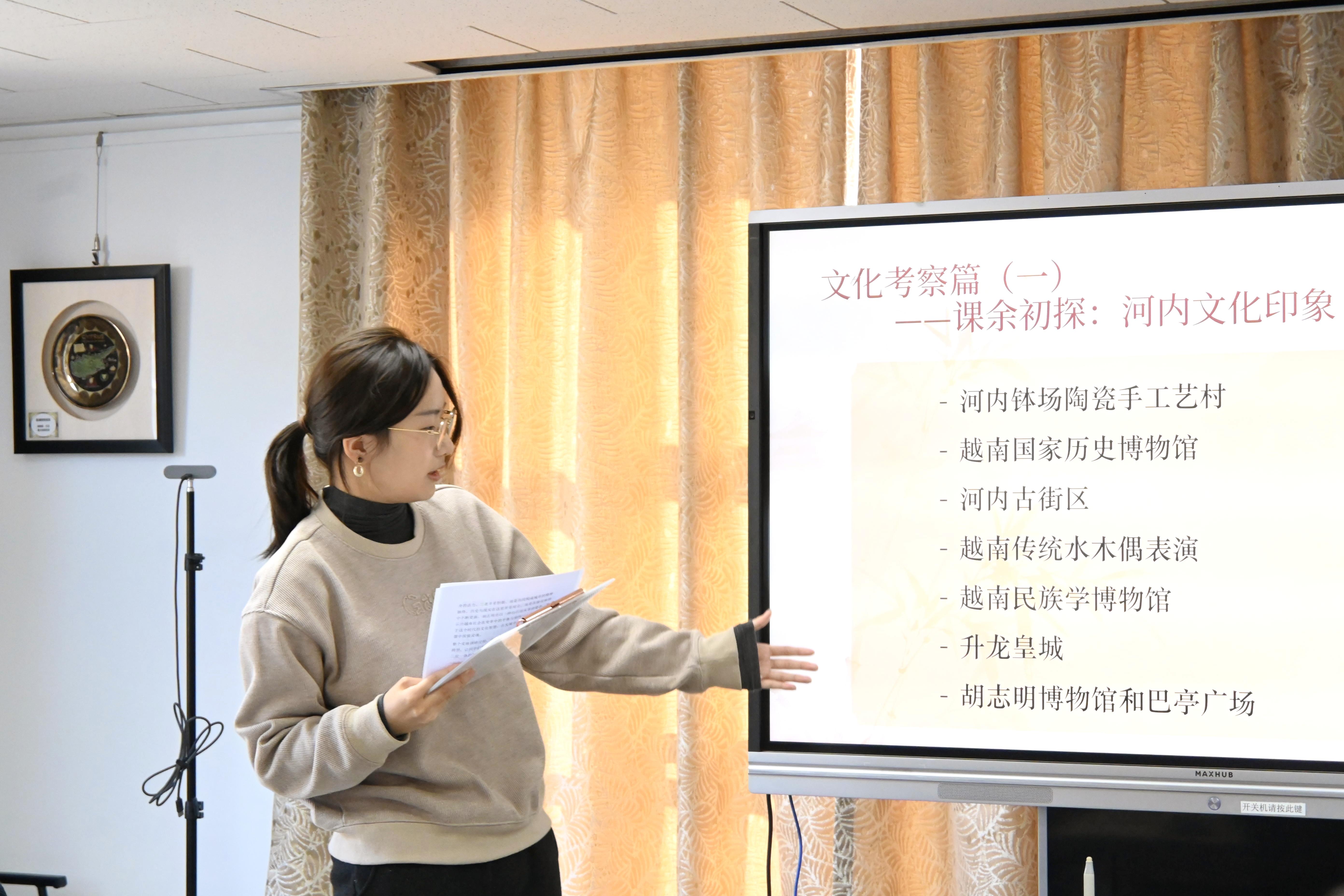 接着,团支书余一可同学进行总结汇报,从理论学习、实地调研、思政交流、调查报告四个方面回顾了本次研学项目。项目六周的行程覆盖了河内、顺化、会安、岘港、芽庄、胡志明市这六座越南城市,帮助同学们构建了越南“历史—文化—现代化”三位一体的知识结构。通过在河内国家大学的课程学习与跨越南北的文化考察,研学实现了从课堂到田野、从知识到研究能力的实质性跨越。同学们深刻理解了翻译工作是跨文化沟通的桥梁,并坚定了作为新时代外语人才,服务国家战略、推动文明互鉴的责任与担当。