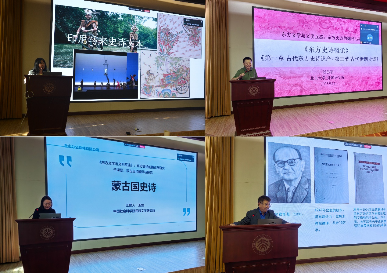 2025年9月14日下午,教育部人文社会科学重点研究基地重大项目“东方文学与文明互鉴:东方史诗的翻译与研究”结项工作会议在北京大学民主楼208会议室召开。会议以线上、线下相结合的方式进行。来自北京大学、中国社会科学院、内蒙古自治区社会科学院、东南大学、西安外国语大学、广西民族大学、鄂尔多斯应用技术学院的18位课题组成员共同参加会议。