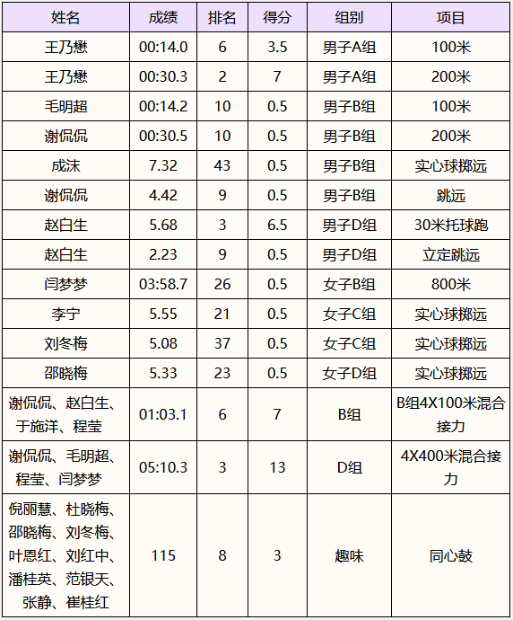 我们的老师们在团体比赛中,如4*400米、4*100米的接力比赛中分别获得第三名和第六名。在个人竞赛中,赵白生老师、王乃懋老师也分别获得第三名、第二名的优异成绩。