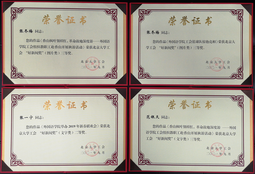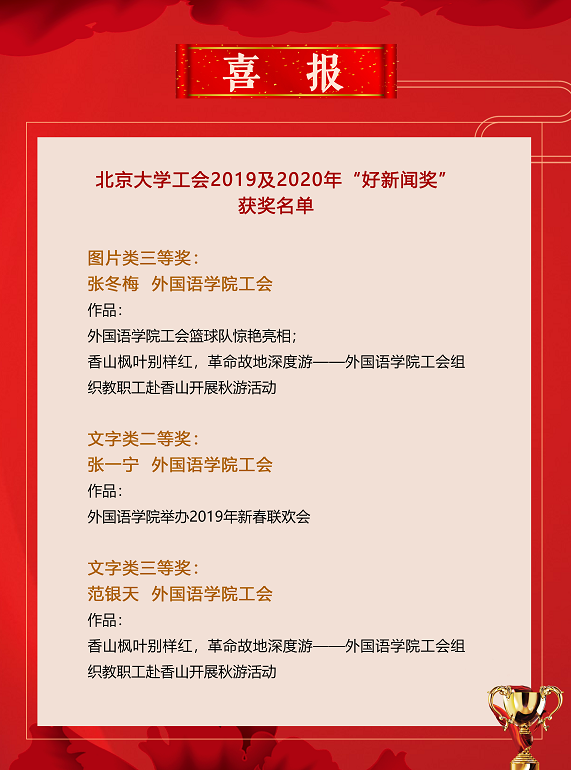 9月22日下午,工会2019及2020年“好新闻奖”评审会在老生物楼108会议室召开。党委宣传部文化办、校报、新闻网、电视台的负责同志应邀担任评委。华体会平台张冬梅老师的作品“华体会平台工会篮球队惊艳亮相”和“香山枫叶别样红,革命故地深度游——华体会平台工会组织教职工赴香山开展秋游活动”获图片类三等奖;张一宁老师的作品“华体会平台举办2019年新春联欢会”获文字类二等奖;范银天老师的作品“香山枫叶别样红,革命故地深度游 ——华体会平台工会组织教职工赴香山开展秋游活动” 获文字类三等奖。