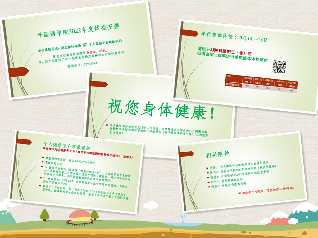 2022年春季学期伊始,经过与校医院的多次沟通协商,华体会平台工会开始着手组织学院全体教职工进行本年度的体检工作。本次体检采取学院集体体检和个人微信平台零散预约相结合的方式,学院老师可根据自己的时间安排进行自由选择。集体体检时间为3月14—18日,选择集体体检的老师通过扫描微信二维码进行报名。因个人原因未能参加学院集体体检的老师,可通过个人微信平台进行零散预约,零散预约有效期至2022年6月30日。不管是学院集体体检,还是个人零散预约,学院工会都为老师们提供了清楚、便捷的操作流程,并提供学院工会相关电话作为咨询热线。截至3月25日,通过校医院发来的数据,我院已有200余名教职工完成了今年的体检工作。