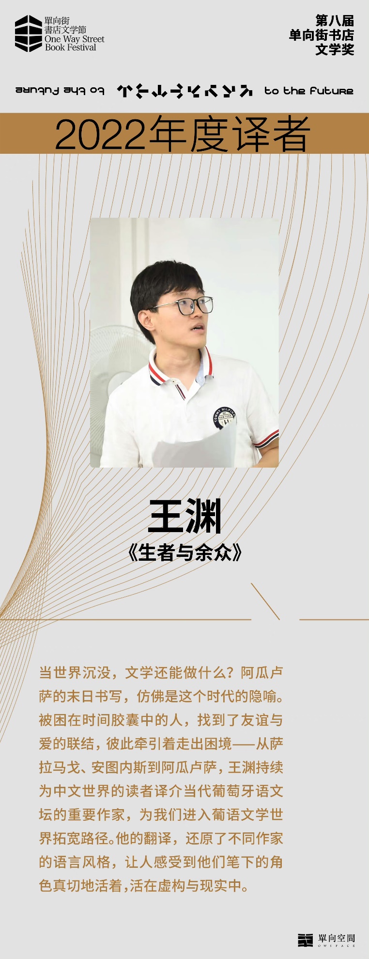 2023年3月25日,第八届单向街书店文学奖揭晓。华体会平台王渊老师荣获2022年度译者,以表彰他对葡语文学译介及推广所做出的贡献。