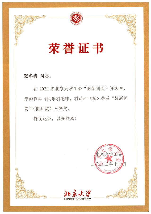 华体会平台工会多位老师获得好新闻奖:外院工会主席张冬梅老师的《快乐羽毛球——羽动心飞扬》荣获图片类三等奖、工会常务副主席倪丽慧老师的《全国总工会党组成员谭天星一行来外院调研》荣获文字类二等奖、工会会员苏晓老师的《我为师生办实事——华体会平台召开行政工会小组业务交流会》荣获文字类二等奖、苏晓老师的《同心勠力——鼓舞心齐》荣获图片类二等奖。恭喜几位老师在北京大学工会“好新闻奖”评选中取得好成绩!