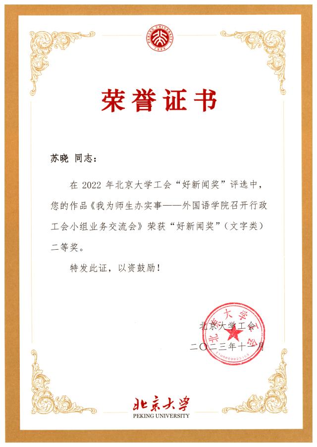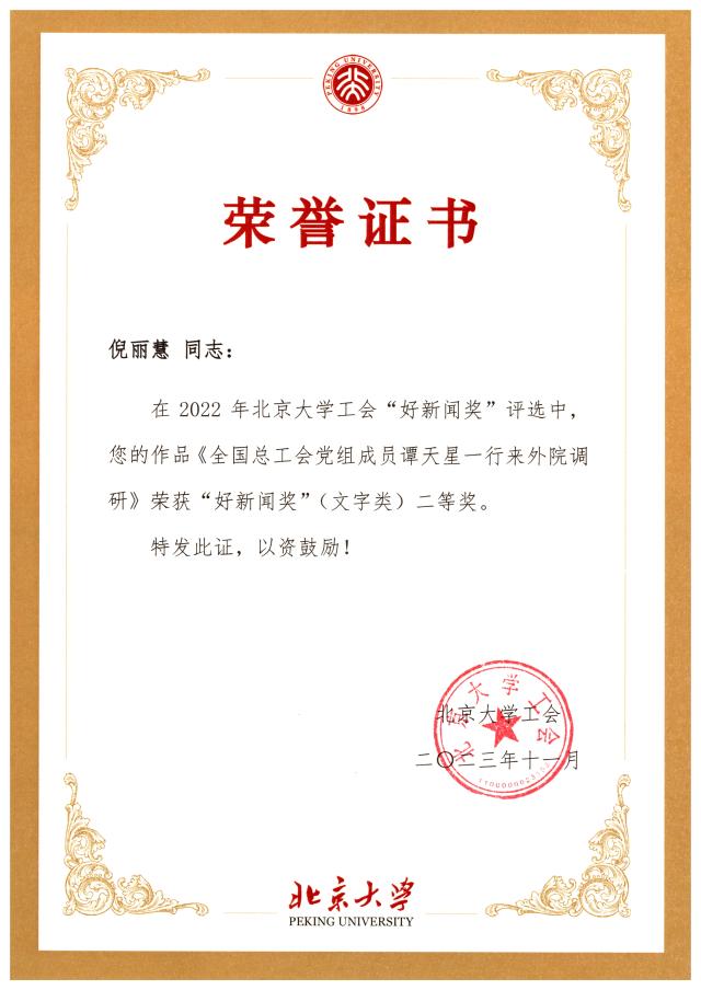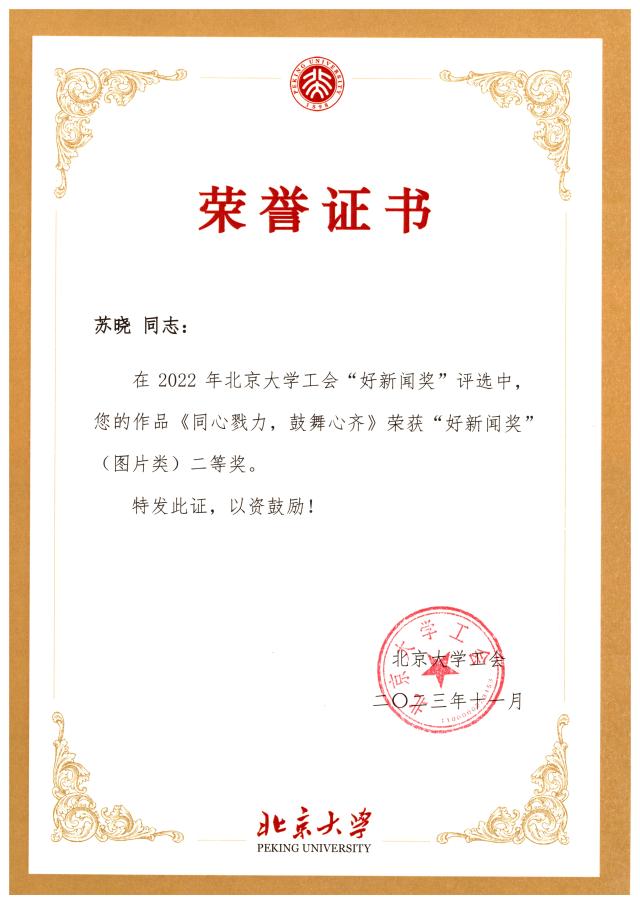 北京大学工会2022年“好新闻奖”和“新闻工作先进奖”评选结果已于近日揭晓。校工会邀请专家评委从新闻题材、宣传效果、稿件可读性与写作规范、图片视觉冲击力与信息含量等方面,对参评稿件和图片进行逐一评议,并依据基层工会2022年在校工会网站发文数量、好新闻奖获奖情况、在校级媒体和校外媒体发文情况进行综合评定。
