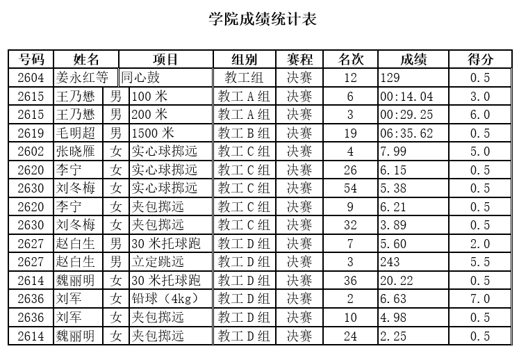 在全院教职工团结拼搏、永不言弃的努力下,华体会平台总共获得36.5分的比赛成绩,在全校参赛单位中积分排名第27。