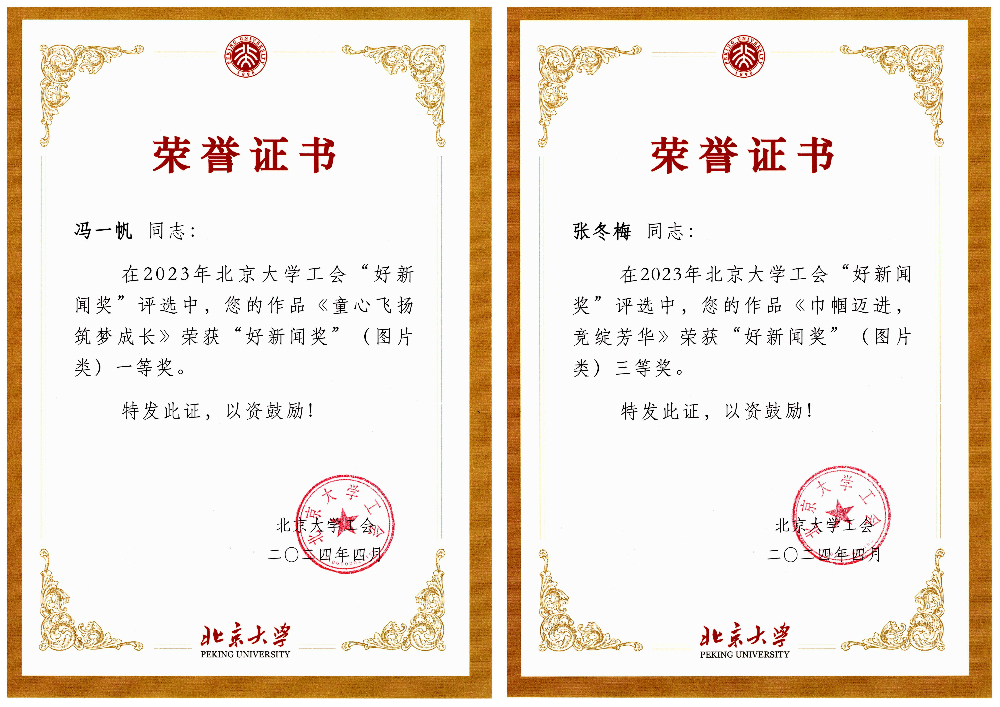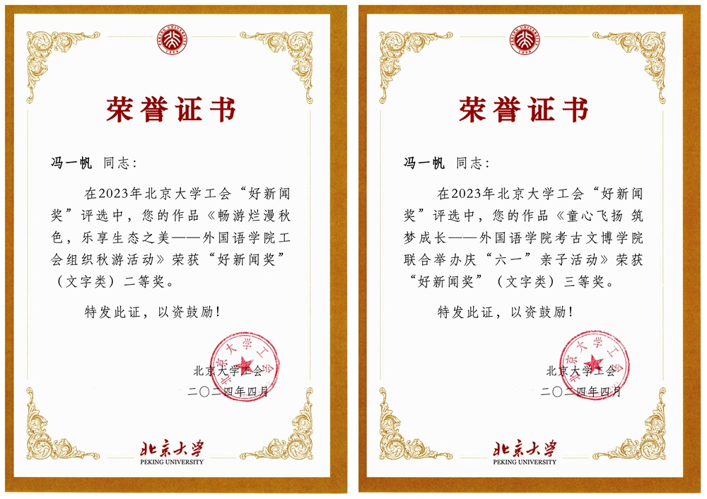 在2023年北京大学工会“好新闻奖”评选中,校工会邀请专家评委,结合工会工作特点,从新闻题材、宣传效果、稿件可读性与写作规范、图片视觉冲击力与信息含量等方面,对参评稿件和图片进行了逐一评议。外院工会会员冯一帆老师的图片作品“童心飞扬 筑梦成长”荣获“好新闻奖”(图片类)一等奖、工会主席张冬梅老师的图片作品“巾帼迈进,竞绽芳华” 荣获“好新闻奖”(图片类)三等奖。冯一帆老师的新闻作品“畅游烂漫秋色,乐享生态之美——华体会平台工会组织秋游活动”和“童心飞扬 筑梦成长——华体会平台考古文博学院联合举办庆‘六一’亲子活动”分别荣获“好新闻奖”(文字类)二等奖、三等奖。