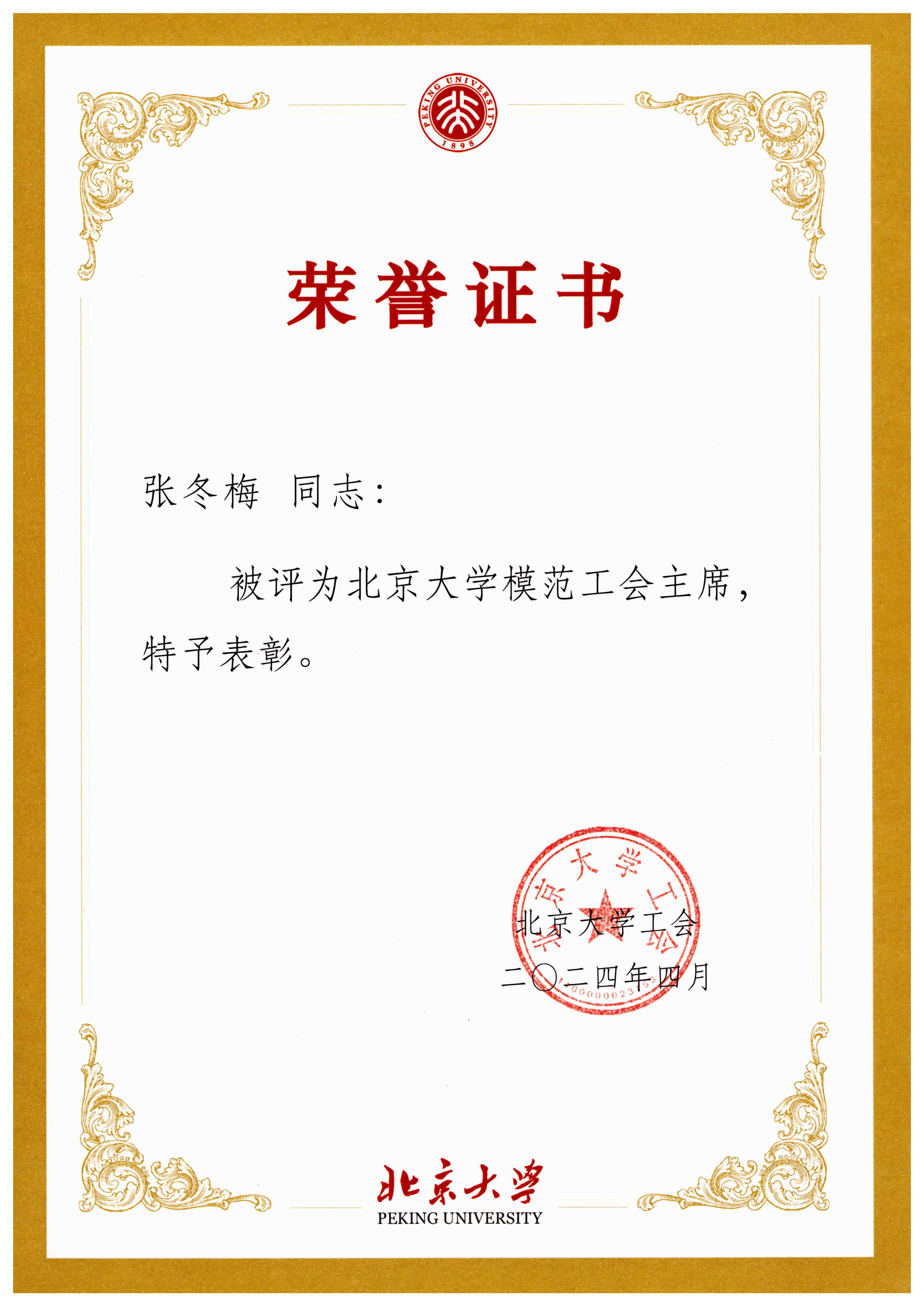 张冬梅老师荣获2023年度北京大学模范工会主席