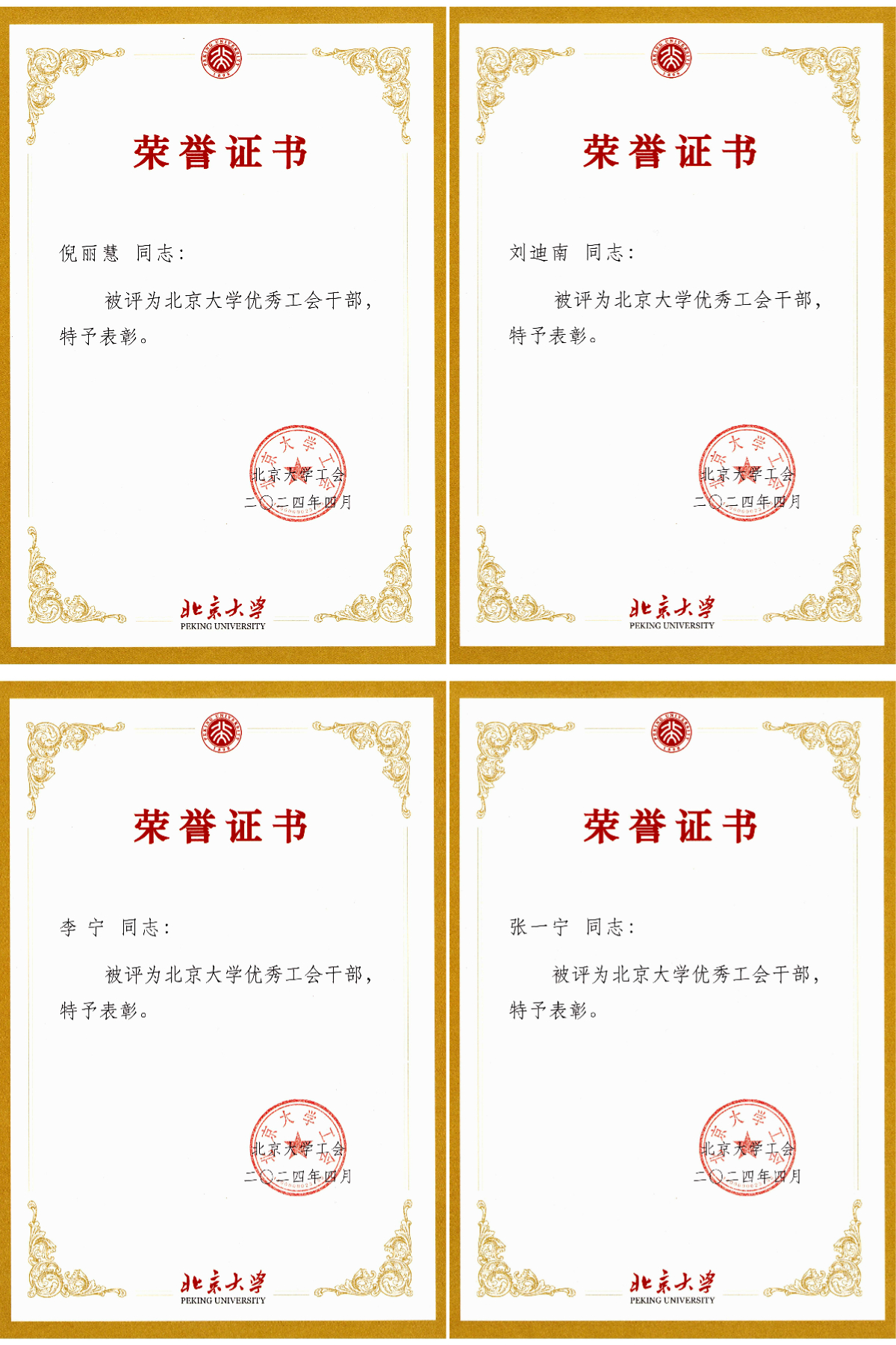 根据《北京大学工会先进集体和优秀个人评选表彰办法》,校工会授予张冬梅老师2023年度北京大学模范工会主席的称号,授予倪丽慧、刘迪南、李宁、张一宁四位老师北京大学优秀工会干部称号。