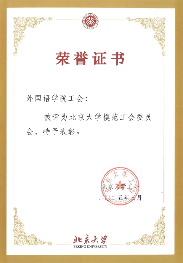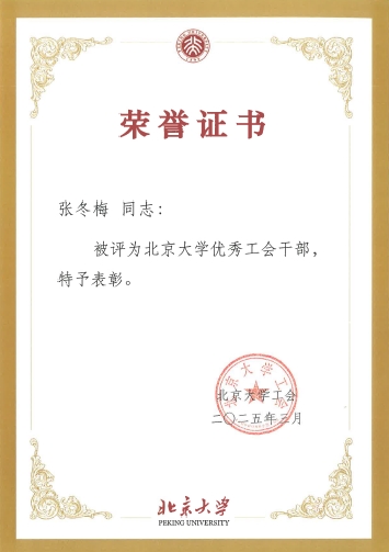 校工会授予罗炜老师2024年度北京大学模范工会主席称号,授予张冬梅、王靖、陈静三位老师2024年度北京大学优秀工会干部称号,授予冯一帆老师2024年度北京大学优秀工会积极分子称号。