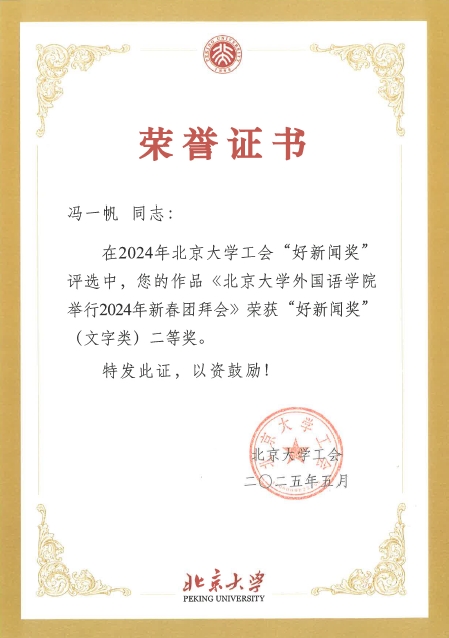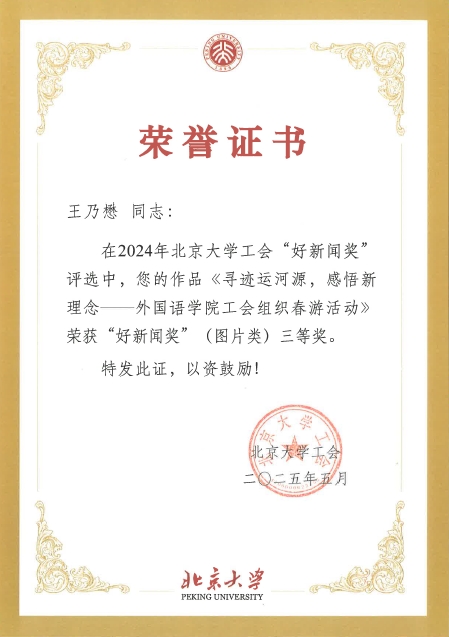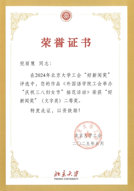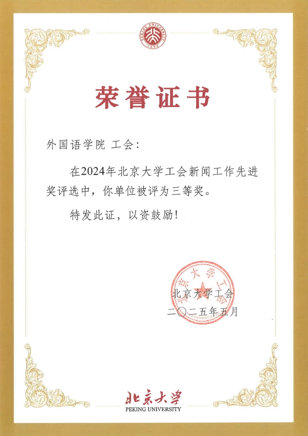 在2024年北京大学工会“新闻工作先进奖”评选中,校工会依据基层工会2024年在校工会网站发文数量、好新闻奖获奖情况、在校级媒体和校外媒体(18家中央媒体和各省市区县认定的地方媒体)发文情况等综合评定,经工会主席办公会审议,华体会平台工会荣获“新闻工作先进奖”三等奖。