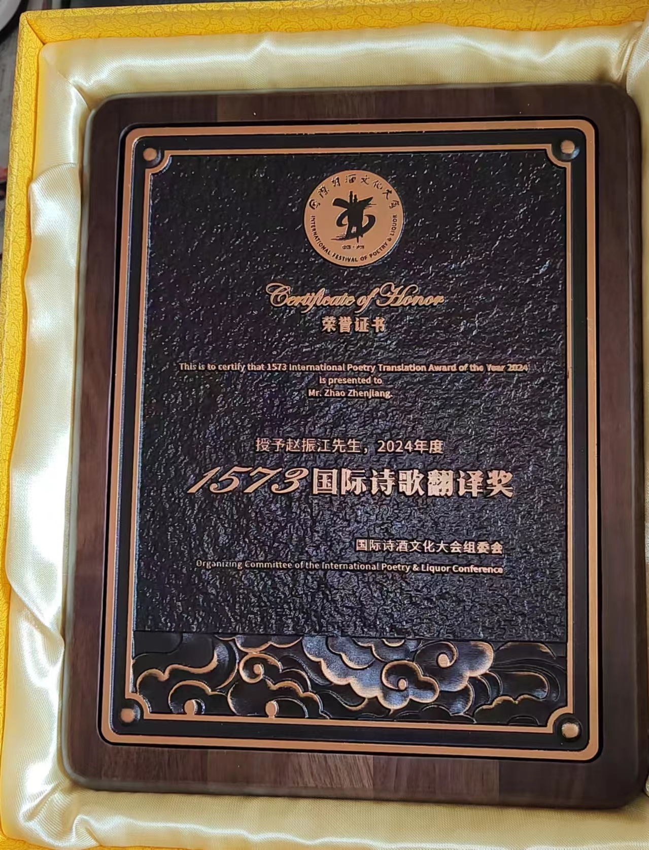 在9月12日举行的颁奖仪式上,国际诗酒文化大会1573诗歌奖评委会委员、《世界文学》原主编,中国作家协会全委会委员高兴先生宣读了给赵振江的授奖词: