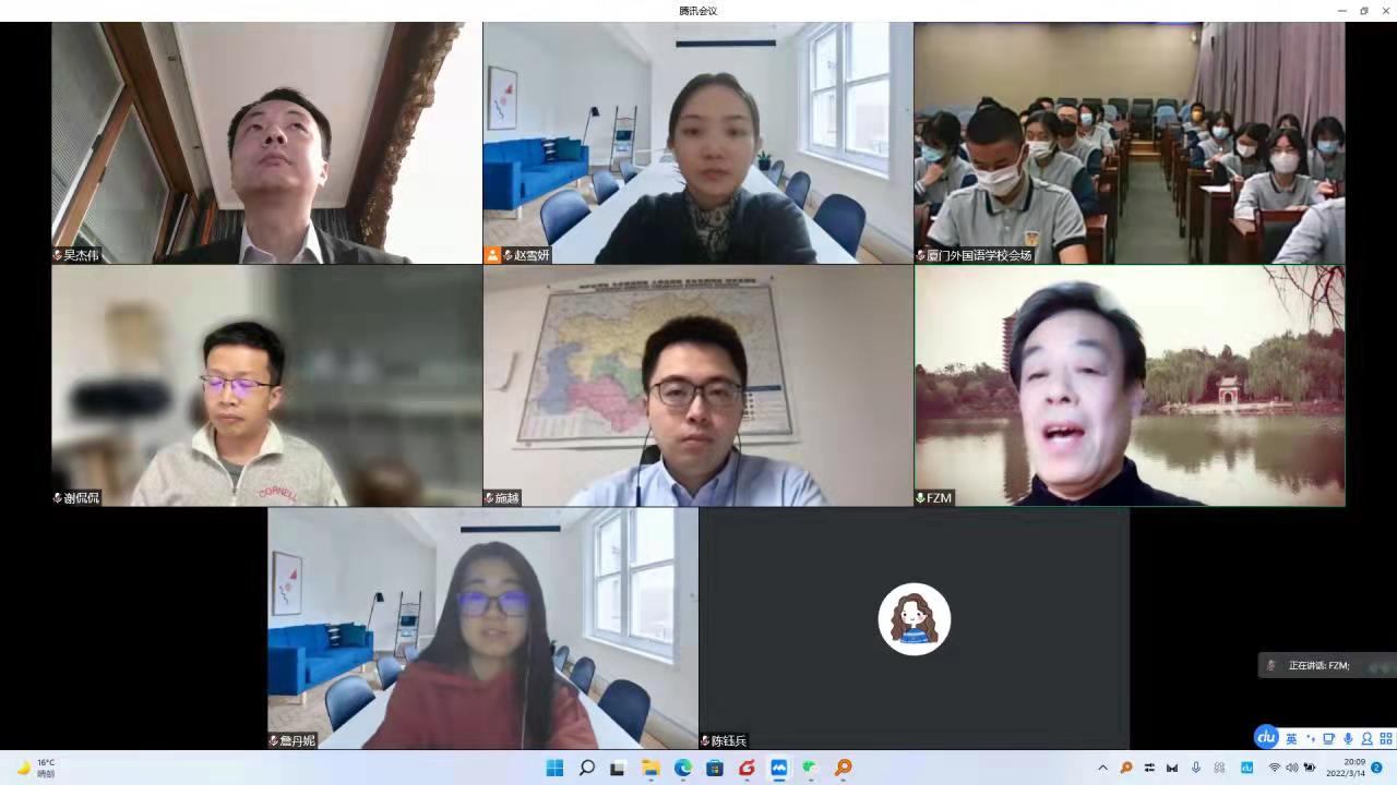 2022年3月14日晚上,华体会平台国别和区域研究专业与厦门外国语学校举行了“从边疆看周边”赴福建省调研团成员的线上见面会。华体会平台的付志明教授、吴杰伟教授、施越助理教授、谢侃侃助理教授及两校的参团学生参加了本次会议。会上,付志明教授向厦门外国语学校的师生介绍了华体会平台本科生开展科研训练、承担科研项目培养的情况,希望在今后加强和厦门外国语学校的交流与合作。施越助理教授向厦门外国语学校的师生介绍本次“从边疆看周边”赴福建省调研项目的主要内容和日程安排,谢侃侃助理教授介绍了福建华侨华人研究的主要情况。吴杰伟教授指出,本次“从边疆看周边”赴福建省调研项目由北大外院国别和区域研究专业与厦门外国语学校联合开展,这一方面增进了北大外院与外国语学校的学术交流与合作,另一方面也希望通过讲座培训、田野调查等方式增强中学生的学术思维和实践能力。