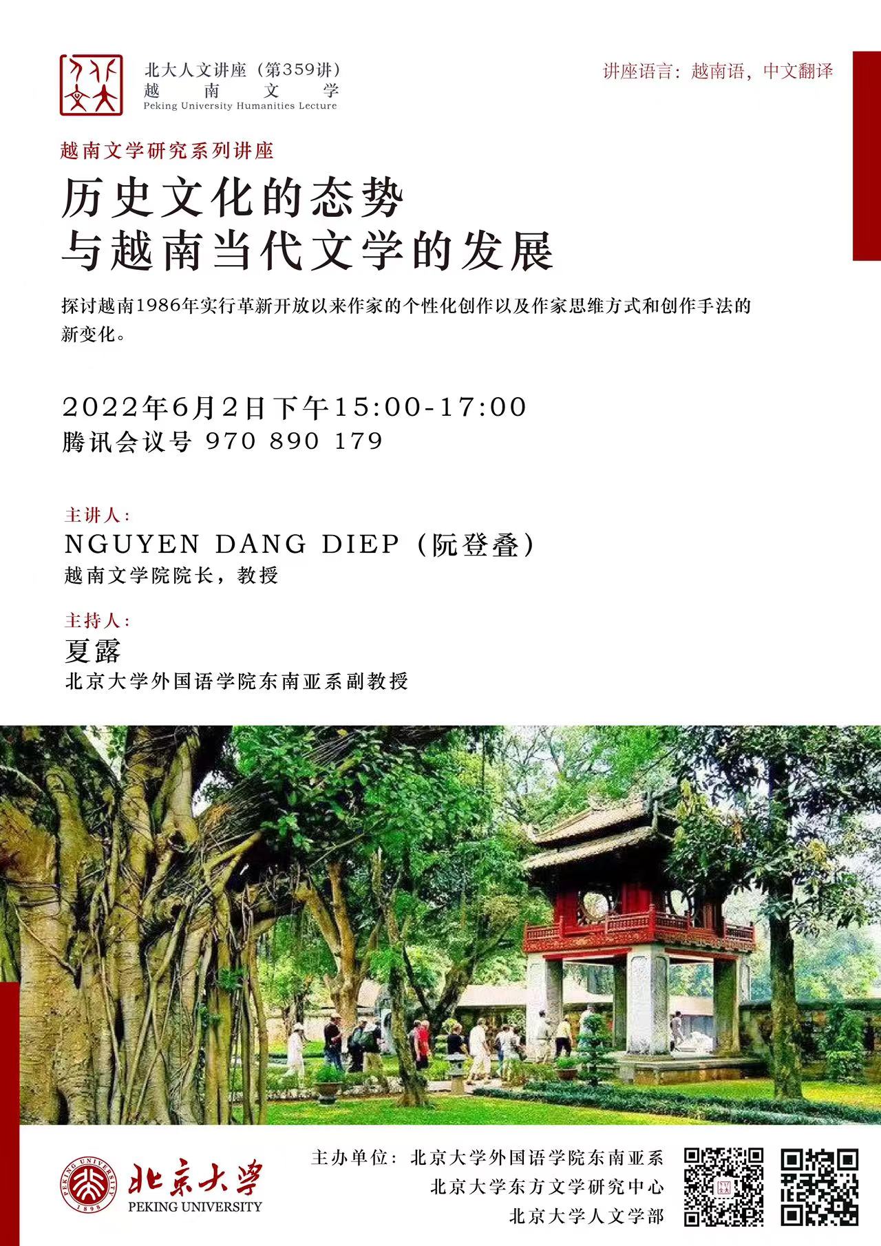 2022年6月2日下午,华体会平台东南亚系联合北京大学东方文学研究中心、北京大学人文学部举办了“历史文化的态势与越南当代文学的发展”主题讲座。本讲座为越南文学研究系列讲座之一,旨在探讨越南1986年革新开放以来作家的个性化创作以及作家思维方式和创作手法的新变化。主讲人阮登叠(Nguyễn Đăng Điệp)是越南文学研究院院长,兼任越南作家协会文艺理论批评委员会主任。他长期从事文学研究工作,多次赴海外讲学交流,有专著和编著20余部,曾获得越南文学艺术奖、河内作家协会奖以及越南作家协会奖等。本次讲座以腾讯会议线上方式举行,吸引了277名师生及关心越南文学的人士在线参加。讲座由华体会平台东南亚系夏露副教授主持,越南文学院青年研究员吴越环博士与华体会平台东南亚系研究生姬美伊、常悦担任讲座翻译。